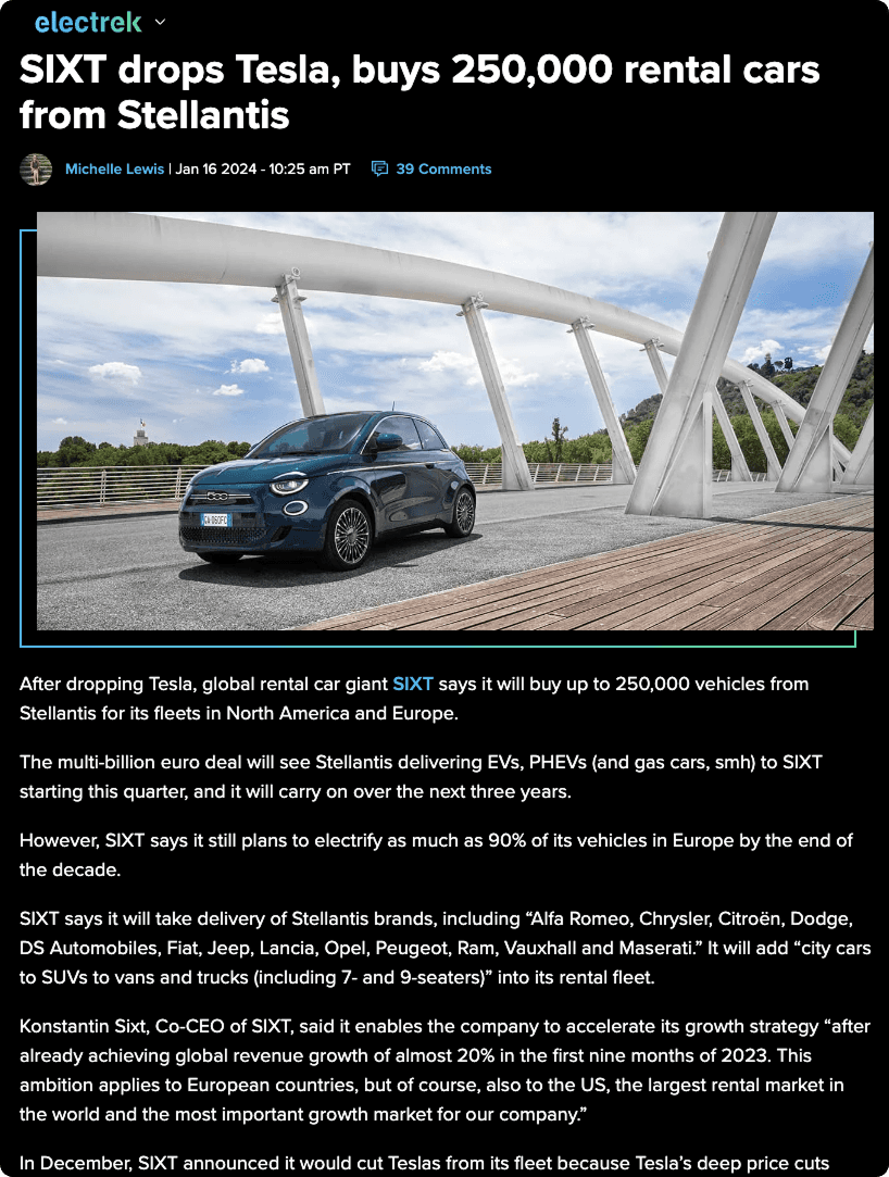Source: https://electrek.co/2024/01/16/sixt-drops-tesla-buys-250000-rental-cars-from-stellantis/